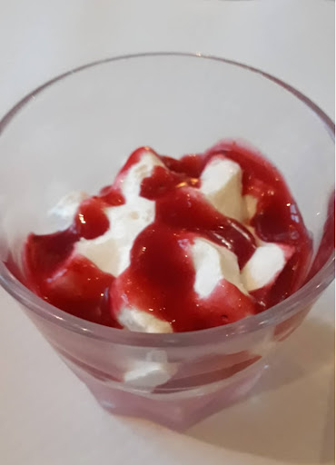 Begleitend wurden noch zwei weitere Runden Ouzo offeriert, die ich jedoch, da mit dem Auto vor Ort, dankend ablehnen musste. Nachdem die Teller abgeräumt wurden folgte ungefragt - und erneut auf Kosten des Hauses - ein kleiner Erdbeerpudding mit Fruchtspiegel als Dessert.