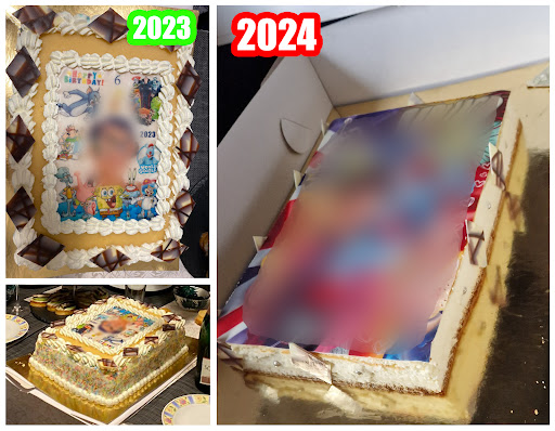 Read moreDas Bild links - Geburtstagstorte aus dem Hause Lohmann vor einem Jahr, das Bild rechts - diesjährige. Die vorgedruckte Fotos auf dem Esspapier auf beiden Torten wurden dem Cafe Lohmann von mir im Voraus zur Verfügung gestellt. Die herrlichen Schokoblättchen am Rande gäbe 2024 übrigens auch nicht, wenn ich beim Abholen der Bestellung nicht die Einfalllosigkeit angesprochen hätte, dann hat der Chef Pâtissier des Hauses doch die Verzierung liebevoll kredenzt! "Das ist doch nur ein Käsekuchen" meinte die nette Mitarbeiterin. Leider, aber ich habe zuerst eine Torte (Philadelphia) bestellt, bekam dann den Anruf von dem Cafe Lohmann, dass es nicht möglich sei und ich z.B. eine Sahnetorte nehmen solle, dann habe ich lieber den Käsekuchen gewählt, weil mein Sohn den mag und die Sprühsahne nicht. Auch wenn es "nur" ein Käsekuchen ist, ist es immer noch ein Geburtstagskuchen für ein Kind und sollte entsprechend aussehen! Also haben wir ein Käsekuchen für 70€ zum Geburtstagsfeier gekauft, unseres Bild hätten wir auch selber drauflegen könnten, was wir nächstes Jahr auch machen werden, schöner aussehen wird es...