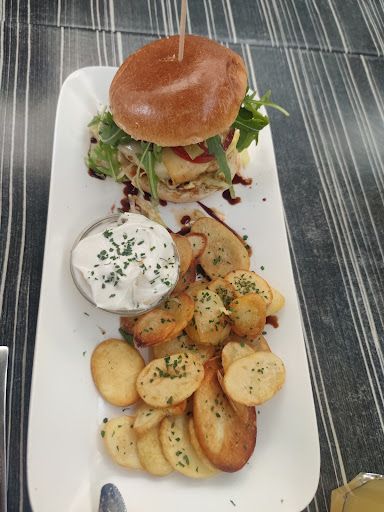 Lokal direkt hinter dem Theater in der Fußgängerzone. Hatten für drinnen reserviert. Da das Wetter gut war, ohne Schwierigkeiten einen Platz draußen bekommen. (Es war für die Bedienung auch kein Problem aus zwei 2er-Tischen einen 4er-Tisch zu machen.) Dienstags gibt es ein spezielles Burger-Angebot: Burger nach Wahl plus eine Fritz-Limo nach Wahl, Beilage muss allerdings extra bestellt (und bezahlt) werden. Wartezeit bis das Essen kam, war ok. Hatte einen Double Cheeseburger (Cheddar u. Mozzarella) mit Papas Bravas geordert - schade, dass auf dem Burger noch nicht mal eine Sorte Käse drauf war - der fehlte stattdessen komplett... Bedienung hat darauf hingewiesen, das richtige bestellt und von der Küche das falsche bekommen zu haben. Eine kleine Entschuldigung hätte mir besser gefallen. Es gab aber zumindest zeitnah einen frischen neuen Burger MIT Käse. Bemängeln muss ich den geschmacklich kräftigen Ketchup auf dem Burger - man schmeckte wenig von den anderen Komponenten. Gut fand ich das durchgebratene, an den Seiten leicht knusprige Pattie (bin kein Freund von rosa gebratenem Fleisch), das war lecker. Zwischendurch wurde sich regelmäßig nach weiteren Wünschen erkundigt und ob alles in Ordnung ist. Bezahlt werden konnte ausschließlich in bar, finde ich nach der ganzen Coronazeit etwas merkwürdig... (Für Kartenzahler gibt es aber direkt neben dem Restaurant draußen einen Geldautomaten der Volksbank...) Toilette befindet sich im zweiten Stock, kein Fahrstuhl. Nichts für Gehbehinderte und/oder...