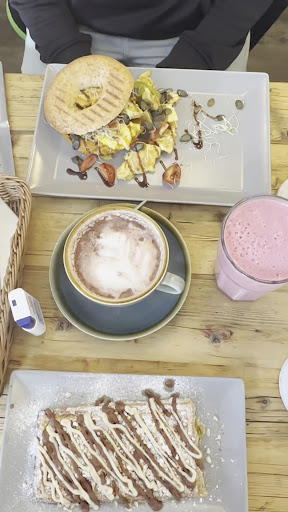 Service freundlich und motiviert. Getränke kamen relativ schnell, doch etwa 45 Min. auf einen Bagel und eine Waffel zu warten ist unverhältnismäßig lang, wir waren direkt um 10 Uhr da.