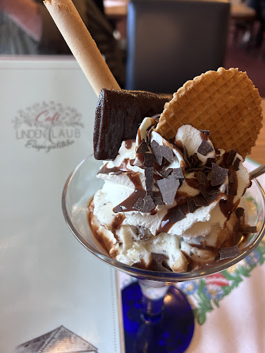 Was für ein tolles Café ... Sonntag, die Sonne lacht und vor dem Caffé stehen 36 Personen artig wartend in einer Schlange aufgereiht auf ein Eis to go. Das allein ist eine Empfehlung für sich. Wir wollten uns aber gemütlich ins Café setzen. Tür auf - Hammer, alles voll und auch der Garten war gut besucht. Und dann dieses gewisse Glück - ein Tisch für drei Personen wurde frei. Wir also hingehechtet wie nichts gutes ... und dann gings auch fast schon los. Die supernette Servicekraft trillerte uns fröhlich alle Eissort vor, und meinte noch, wenn ich die jetzt genausoschnell und fehlerfrei runterrattern könnte, wäre die Rechnung für diesen Tisch bezahlt ... ich habe dann doch die Schwarzwälder Kirschtorte gegessen. Eine gute Wahl. Meinem Kind habe ich das halbe Eis geklaut (was für eine umwerfend gute Qualität). Der Kaffee war ebenfalls lecker. Bei allem Stress waren alle Servicekraft schnell, höflich hatten immer noch ein offenes Ohr für Nachbestellungen und reicht eifrig bemüht, alles schnellstmöglich zu servieren. Alle Gäste waren tiefenentspannt. Preis/Leistung steht hier in einem guten Verhältnis. Klar das wir wiederkommen werden. Danke an das ganze Team Café Lindenlaub. Sehr gastfreundlich, alles bei...