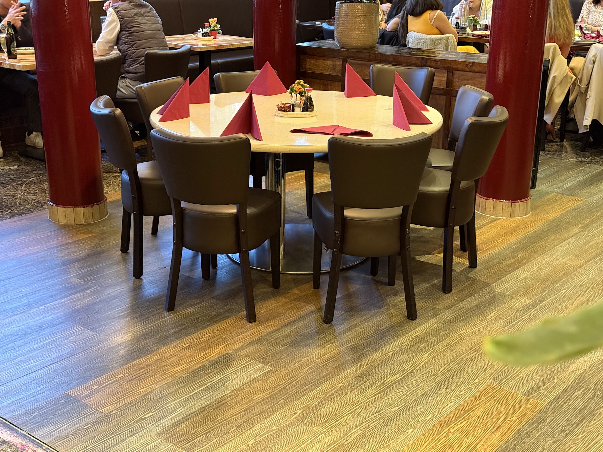Wir waren an unserem ersten Hochzeitstag abends dort und unsere Erwartungen wurden übertroffen. Wir hatten einen Tisch für zwei reserviert. Eine sehr freundliche Dame, sagte uns, wir könnten uns einen Tisch aussuchen. Obwohl das Restaurant ziemlich groß ist, ist es wirklich sehr gemütlich. Es gibt diverse Nischen. Die Bänke und Stühle sind dick gepolstert und richtig bequem. Auch hatten wir viel Platz. Die Toilette habe ich nicht benutzt, aber der Vorraum mit den Waschbecken und Papierhandtuchspendern war geräumig und sauber.