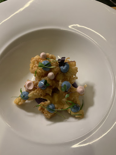 Unser „Gruß“ bestand – soweit ich es noch hinbekomme – aus einem Radieschen im Teigmantel auf Popcorn-weiß-der-Geier mit Kräutern und Rosenblättern. Nie wurde ein Radieschen standesgerechter zu Grabe getragen!