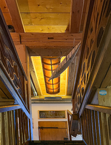 Über eine Holztreppe gelangt man in das Obergeschoß, das dann endgültig jeder Beschreibung spottet. Erneut vom Holz dominierte, liebevoll ineinander verschachtelte Räume mit einer bewundernswerten Freude am designerischen Detail.
