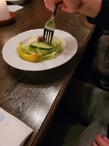 Read moreRecht altbacken wirkendes griechisches Restaurant.Nachdem wir einen Ouzo als Begrüssungsgetränk erhielten,bestellten wir unser Essen.Das waren einmal griechisches Hacksteak Bifteki mit Pommes und Salat und einmal Gyros mit Zwiebeln und Metaxa Souce,dazu ebenfalls Pommes.Nach normaler Wartezeit kam das Essen,obwohl der Laden zwar nicht voll,aber recht gut besucht war.Das Essen war dann aber eher mau...es war nicht wirklich schlecht,aber gerade bei den Bifteki hatte man den Eindruck,das es sich um gekauftes Hack,welches aus Fleisch gepresst direkt aus dem Supermarktregal kommt,handelt.Auch die Gyros waren irgendwie trocken und auch geschmacklich irgendwie nicht so,wie man es eigentlich kennt.Ohne die Metaxa Souce wäre das bei weitem zu trocken gewesen.Die Pommes dafür waren aber lecker.Was wirklich gar nicht schmeckte,war das Zaziki.Damit stimmte irgendetwas nicht,war mein Eindruck.Aber gut,hatte davon nur nen kleinen Klecks auf dem Teller,den ich nach kurzen probieren lieber liegenließ,da ich ja schon Gyros mit genügend Metaxa Souce auf dem Teller hatte.Alles in allem...nicht wirklich herausragendes Essen...dafür gute Parkmöglichkeiten...