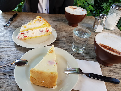 Handsome building, with beautiful painted ceilings. We only intended to take a cappuccino, but in addition came one of the warm breads "Stramer Moritz" as well as two vegan cakes - made from spelt flour and cane sugar. The conditions are excellent and congenial. We have found our coffeeplace. Parking on site is available but if none is free you can switch to the parking garage across the street. In summer, this must have a...