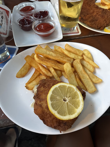 Door de mooie Google reviews terechtgekomen op deze unieke plek. Een aanrader! Het zag er gesloten uit, maar toch stapten wij met ons gezin van 5 personen naar binnen. Meteen werden wij vriendelijk ontvangen door de gastheer. We konden op het terras zitten waar het gezellig druk was. Als toeristen voelden we ons tussen de ‘locals’ op ons gemak. We bestelden salade, schnitzel, curryworst en cordon bleu. Alles van goede kwaliteit en goed op smaak. Er kwam zelfs mayonaise op tafel toen wij dat vroegen. Ook de drankjes werden vlot aangevuld. Alles werd vers bereid, dat duurde iets langer, maar het was het wachten waard. Na een heerlijke maaltijd en leuke gesprekken met de mensen op het terras, gingen wij voldaan terug naar ons hotel. Let op: alleen...