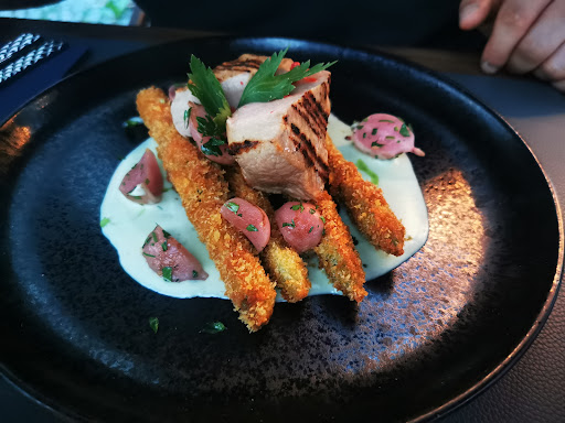 Read moreFine dining ODER...................... Wie der Schwabe sagt : "a kunschdt auf'm deller" 😜 Ich sags mal so erster Eindruck von außen vom Lokal: unscheinbar, man kommt in das Lokal und denkt sich (für meinen Geschmack) wow stilvoll, modern, hat etwas von derb durch die dunklen Farben, aber Mega toll zum verweilen...die WCs sind sauber. Kellnerin sowie Mitarbeiter in der Küche / hinten haben ein gutes gepflegtes Äußeres. Ganze Belegschaft ist nett, freundlich-könnte nicht meckern. Hatten ein 4 Gang - Menü,was gerade in der Karte stand. Ein kleiner Gruß aus der Küche gab es ebenfalls für meinen Geschmack etwas zu süß, aber zum Glück sind Geschmäcker verschieden, dennoch war es sehr lecker. Im Allgemeinen muss ein tolles Lob ausgesprochen werden für die frische der Lebensmittel, die mit bedacht für jedes einzelne Gericht ausgesucht und verarbeitet wurde..Die 4 Gänge stimmten geschmacklich sowie von der Anrichte her super auf einander ab. Tolle Auswahl an Geschirr, da wurde sich definitiv Gedanken gemacht. Größer Pluspunkt :Ich konnte keine braunen Stellen, Verwelkungen oder ähnliches feststellen (worauf ich sehr großen Wert lege). Am Dressert hat mir besonders gefallen das es sehr leicht war, die Frischkäsecreme auf dem Keksboden war sehr leicht für den Gaumen, angenehmes Gefühl beim Essen, sowie das es nicht Kühlschrank kalt war.