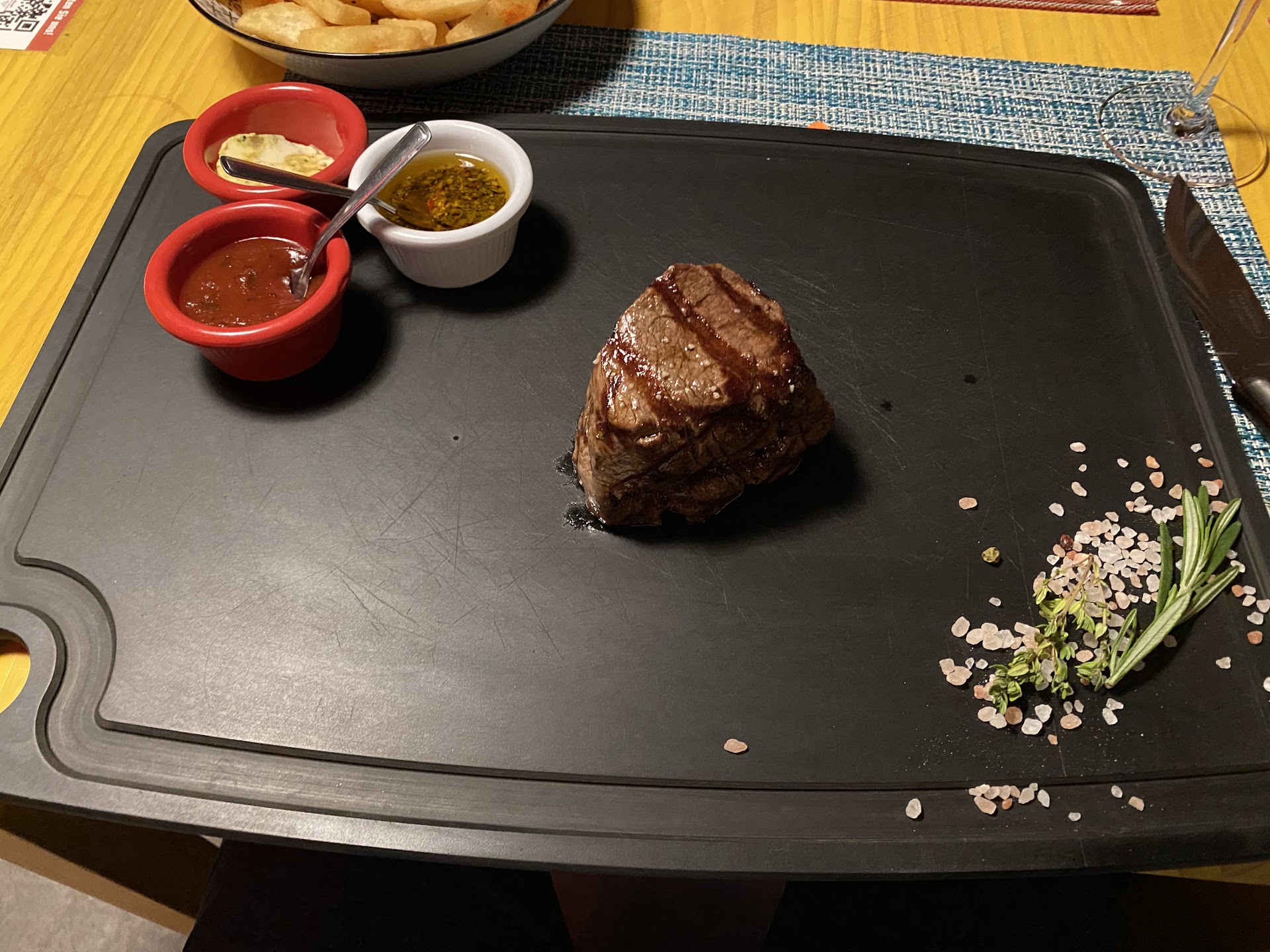 My little one walked in, inhaled and said excitedly, "Meat!" I don't even eat red meat but I knew my husband and my daughter were about to get some good steak! First, my husband and I were so impressed by the presentation on cutting board with herb butter, chimichurri sauce, a sweet spicy red sauce, rosemary, and a variety of salts and seasknings. His entrecote (ribeye I think) and my pork chop didn't need them but it was amazing to try out even more tasty flavors. We got the spinach, steak fries, and white rice as sides and all were delicious!!! I felt like the taste found here is so hard to find in Germany. It was authentic and not a mix of different cuisines as found in so many restaurants. The owner was so friendly and he and staff kept checking on us. We were driving from Triberg to Kaiserslautern and just wanted a good meal and thank Google that we found this amazing restaurant!! Don't pass it up! It's worth...