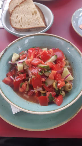 "Fresh Israel(?) Salad: Gurken, Tomaten, grüne Oliven, rote Zwiebeln (+ hausgemachter Hummus 4 €) 9,90 €"