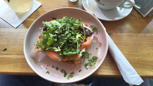 Weiter geht es mit "Herzhafter French Toast mit Räucherlachs, Pflücksalat, Meerrettich und Kapern". Der Toast ist ein spitz zulaufendes Endstück, und die Schärfe des dick aufgetragenen Meerrettichs ist (selbst für mich, der es würzig mag) sehr dominant. Die Personalreferentin hat die gleiche Wahl getroffen. Für sie ist es so scharf, dass sie es nicht aufessen mag. Als sie das dem Service berichtet, wird ihr der Rest kommentarlos (sehr schön) eingepackt. Kartenzahlung ist nicht möglich.