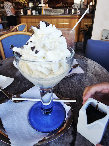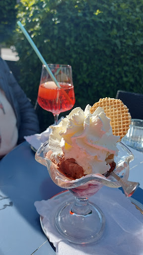 Read moreEin Stern ist schon zuviel! Die ganzen guten Rezensionen sind mir ein Rätsel. Wir waren Sonntag Nachmittag dort und setzten uns an einen leeren Tisch. Der Außenbereich war gut besucht. Ab jetzt war viel Zeit nötig: 15 Minuten bis uns irgendjemand vom Personal wahrnahm und Karten an den Tisch brachte, nochmal 20 Minuten, bis unsere Bestellung aufgenommen wurde (Kaffee und 2 Eisbecher), weitere 20 Minuten, bis der Kaffee kam. Auf Nachfrage, ob wir die Eisbecher auch bald bekommen, kam die Antwort, die Bestellungen würden nach Eingang abgearbeitet. Sorry, das kann nicht sein. Drei Tische um uns herum wurden später besetzt, aber dort lief es wesentlich flotter. Irgendwann kamen die Eisbecher mit der nächsten Enttäuschung. Das Eis ist nicht besonders cremig, hat kaum Geschmack und sieht wie billiges Eis aus dem Supermarkt aus. Zahlen geht nur drinnen an der Kasse. Das muss man übrigens selbst rausfinden. 🥴 Und wen wunderts, wieder wird man glorios ignoriert. Immerhin konnte ich in der Zeit das Geschehen hinter dem Tresen beobachten. Es herrscht totales Chaos. Die Abläufe sind völlig unzureichend organisiert. Es ist meiner Meinung nach genug Personal vorhanden, aber wenn es an den Zuständigkeiten (es darf wohl nur die Chefin kassieren) und der Organisation hapert, dann ist das Chaos vorprogrammiert. Der Blick, als ich mir das Rückgeld exakt rausgeben ließ, war das einzig originelle an unserem Besuch. Fazit: lange Wartezeit, unorganisiertes Personal und dazu noch eine ganz...