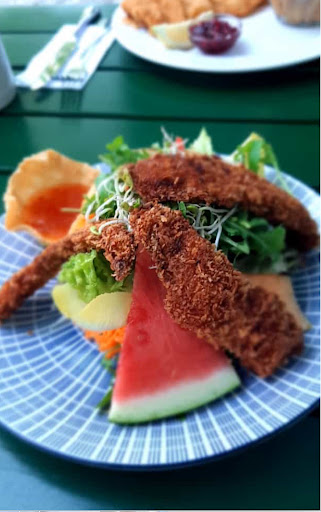 Wir waren mit dem Wohnmobil da. Auch sind wir in den Biergarten zum Abendessen gegangen. Die Kosten des Stellplatzes wurde mit essen und trinken verrechnet. Das Schweineschnitzel war dünn, dennoch mit einer feinen Panade und schmeckte wirklich gut. Der Beilagensalat war frisch und knackig. Der Karibische Salat Kokoshähnchen war sehr gut. Das Bier und das Radler waren sehr gut.
