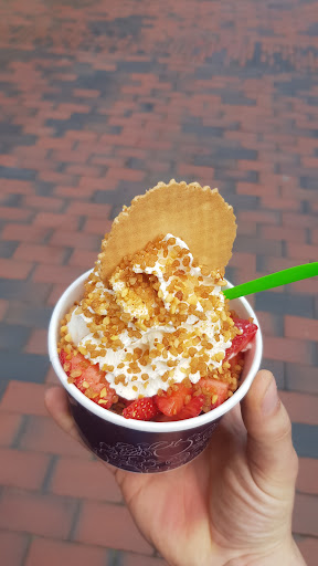 Der sowieso schon überforderte Mitarbeiter, sprühte Sahne unten in den Plastikbecher, dann wurde der fast leere Vanilleeisbehälter ausgekratzt, die "Kugel" auf die SprühSahne in den Becher, und noch so eine "Kratz-Kugel" in die Eispresse. Dies wurde dann als "Spagetti" auf die andere Kugel gepresst. Erdbeersosse drauf und fertig war der Sabsch.