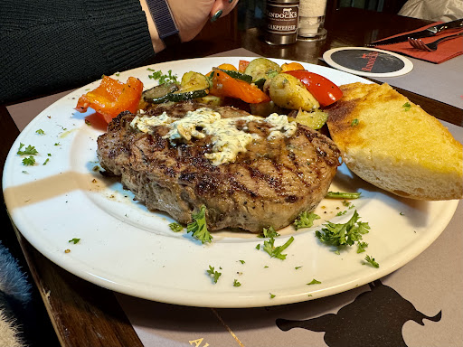 Read moreIch war heute zum ersten Mal mit meinem besten Freund hier - aber sicher nicht zum letzten. Wir sind zur "Happy hour" gekommen, in der die Steaks zu reduziertem Preis angeboten werden. Ich hatte das 250g Riby-eye medium rare bestellt, mein bester Freund nahm das Huftsteak. Der Salat vorneweg schon eine ordentliche Portion mit leckerem Dijonsenf-Dressing. Als die Steaks kamen hörte ich hinter mir ein zischendes Bruzeln... das Steak wurde auf einer heissen Gusseisenplatte serviert, das wiederum auf einem Holzträger ruhte. Optisch und akkustisch schon mal ein Volltreffer. Das Messer - einziger Kritikpunkt - war etwas stumpf, aber das Fleisch war SENSATIONELL! Eins der besten Rib-eye Steaks ever. Baked potatoe samt sour cream sehr lecker, ebenso das Röstbrot. Wirklich rundum gelungen, auch dank des netten Service und das ganze dann für 21,90€. WOW! TOP!