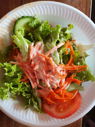 Im Beilagensalat war eine Scheibe Salatgurke und eine halbe Scheibe Tomate. Die Gurke war schon total abgetrocknet und hatte einen welligen Rand, die Tomate mit grünem Strunk. Das wäre bei mir im Biomüll gelandet.