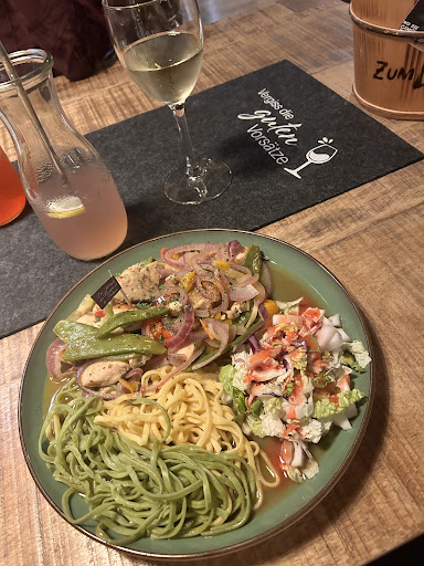 Read moreOptisch hat das Essen ganz gut ausgesehen als es endlich nach 1 Stunde 20 Minuten !! Wartezeit endlich kam - geh null ! Ja der Laden war 80% voll aber überschaubar groß und es hatten schon viele bestellt. Zum Essen: ich bin kein Mensch der salzig isst aber das hatte nicht mal eine Prise Salz dran. Es hatte wirklich nach NICHTS geschmeckt, null! Kein bisschen gewürzt oder Kräuter ect dran, nur zur Deko drüber. Das Gemüse war einfach in Wasser gekocht, fertig. Dazu Nudeln und angebratene Fleischstückle, das war’s. Absolutes no Go: der Beilagensalat mit auf dem Teller und hat im Gemüse/Fleisch- Dünstwasser geschwommen.