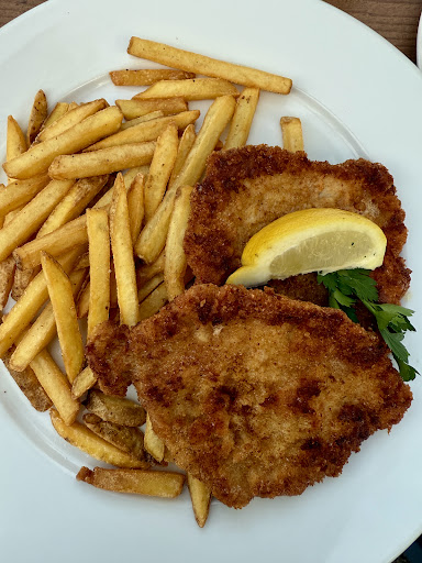 The service was great! The food was great! Everyone ate schnitzel with chips or potato salad and a fresh side salad.