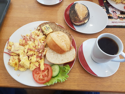 Das Brot ist nicht ganz meins. Der Kuchen und das Gebäck sind in der Regel frisch. Ich habe noch keine alte Ware bekommen. Brötchen werden auf Wunsch ohne zu zögern belegt. Die Verkäuferinnen sind sehr freundlich. Auch wenn außerhalb des Cafés anderes erzählt wird. Wie man ins den Wald... . Ihr kennt es. Einen einzigen Kritikpunkt habe ich und deshalb nur 4 Sterne. Die Sauberkeit der Tische. Es werden keine Tische abgewischt wenn der Platz verlassen wird und von Desinfektion nichts zu sehen. In Zeichen von Corona nicht vorbildlich. Da bringt es auch nichts wenn Kunden vor der Tür warten müssen weil sich zu viele Personen im Eingangsbereich aufhalten. Bis auf weiteres werde ich im Cafe nicht...