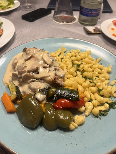 Bei uns am Tisch hat sich bei der Hauptspeise fast jeder für das 391 Ochsenfiletsteak mit Pfefferrahmsoße, Herzoginkartoffeln und Salat entschieden. Das Steak war auf den Punkt genau medium gegart. Geschmacklich wirklich perfekt und für mich die richtige Entscheidung gewesen, selten ein so gutes Stück Fleisch gegessen. Absolute Empfehlung! Die vierte Person entschied sich für 53 Veseli Bosanac Rindfleisch gefüllt mit Käse, Ajvar, Zwiebeln, Djuvecreis, Pommes frites und Salat und war auch zufrieden mit ihrer Wahl.