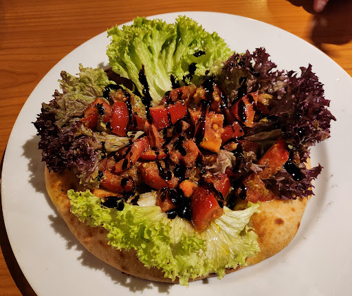 Nur 4 Sterne, weil: Die Einrichtung ist rustikal, wirkt aber nicht gebraucht oder gar abgenutzt. Sie wirkt so, als könnte sie sich nicht entscheiden was dieser Gastrobetrieb sein soll. Die dunklen Holzvertäfelungen lassen ein klassisches Wirtshaus benutzen vermuten, was die Stühle ein bisschen unterstreichen, und auch wieder nicht. Die Vertäfelung wird von Nischen mit Ziegelrundbögen unterbrochen, in denen Regale angebracht sind. In diesen stehen Weinflaschen. Diese Rundbögen passen sehr gut zum Steakhousecharakter, denn die Stühle zum Teil auch unterstreichen. Was die Stühle betrifft. Die Rückenlehnen sehen wie bei klassische Wirtshausstühlen aus. Die Sitzflächen waren, bei den Stühlen die ich gesehen habe, aus Flechtwerk. Und das passt m.M.n. gut zu einem Steakhouse. Ja, und dann noch die Tische. Sie sind von einfacher Machart. Keine Tischplatte aus Massivholz, sondern zweckmäßig wohl aus Pressspahn und laminiert. Sie wirken nicht wie billige Discountertische, sondern schon hochwertiger. Doch gerade die Kombination wirkt etwas unentschlossen. So als wäre dem Wirt oder dem Verpächter vor lauter Ideen was man hier für eine Gastronomie betreiben könnte, das Ziel auf den Augen geraten. Und letztlich hat man sich für ein Steakhouse, in einer Pizzeria mit Wirtshauscharme entschlossen.
