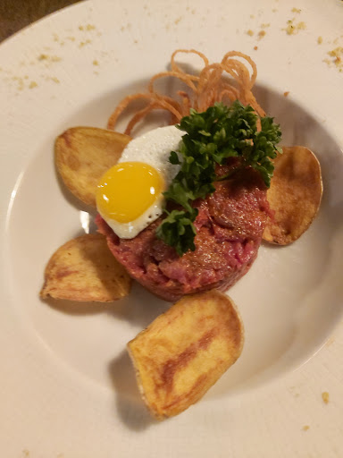 Ein schönes Gebäude an sich, auch rundherum mit den Oldtimern bestimmt nett anzuschauen(wir waren abends zu Besuch), das Restaurant war von außen null dekoriert, kein Speisenkartenaushang/Tafel etc.. Wenn man dann also hinein kommt steht man erstmal vor einem verschlossenen 3-Meter-Vorhang, das erschien mir etwas seltsam, aber nun gut. Wir hatten vorreserviert, bis wir dann zu Tisch geleitet worden sind ,verging eine geraume Zeit mit Löcher in die Decke starren. Zu Tisch bekamen wir dann sofort die Speisenkarte, was jetzt nicht schlecht ist, Getränke waren auch relativ schnell da und einen kleinen Appetizer gab es auch! Als Vorspeise bestellten wir ein Beef Tartar, sehr klein Gehalten für 15 Euro auf unmariniertem Salat , das Brot wurde abgefragt, mit was soll man das denn sonst essen?! Als Hauptgang bekamen wir (2 Personen ) ein Rumpsteak und ein Filetsteak, das Rumpsteak war sehr schlecht gegrillt, wahrscheinlich auch mit zu geringer Temperatur und damit auch der Fettrand, der gegrillt einfach super schmeckt, ungenießbar, die Kräuterbutter(für 2 Euro extra!!) war ein Versuch sie aufzudressieren und für ein Steakhaus viiieeel zu klein, Leute in einem Steakhaus gibt man die Kräuterbutter als Garnitur selbstverständlich immer mit auf den Teller. Auf dem Steak war gefühlt eine halbe Steige Kresse garniert, geht auch mal sowas von nicht! Die Bratkartoffeln wurden entweder schlecht frittiert oder noch schlechter gebraten, die Champignons mit Speck waren mittags angebraten und abends erhitzt, somit alt. Die Bedienungen haben auf mich sehr verunsichert gewirkt, waren höchst wahrscheinlich auch nicht gelernt aber für diese Preisklasse muss ich einfach geschultes Personal haben.Es wurde ständig falsch serviert, nachdem wir fertig waren wurde uns gesagt sie lassen es noch stehen?vielleicht bekommen wir ja wieder Hunger , oder so....Nein. Die andere Bedienung hat uns dann endlich von den nicht verspeisten Sachen erlöst und schließlich wurden wir noch gefragt ob man die leere! Wasserflasche mitnehmen könnte.....ich wollte sie eigentlich im Pfandautomat morgen abgeben.... Im Großen und Ganzen: ich habe schon in vielen Steakhäusern gegessen und gearbeitet, da müsst Ihr definitiv umstrukturieren um irgendwo mithalten zu können, mit dem Ambiente habt Ihr auf jedenfall Potenzial, aber der Rest war...