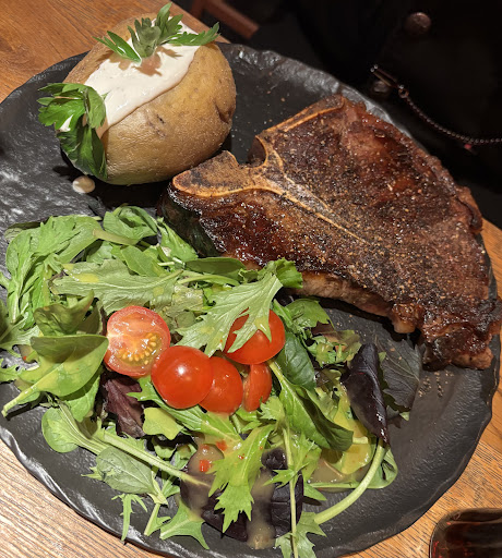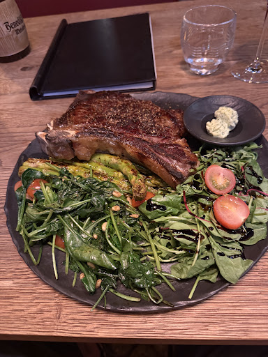Read moreMir ist nicht ganz klar wie dieses Restaurant eine so hohe Durchschnittsbewertung erhalten hat. Die Lage ist exzellent und das Ambiente rustikal aber gemütlich. Speisekarte ist nett gemacht, wirkt aber wenig hochwertig und eher nach einem Durchschnittsrestaurant. Wählte das T-Bone Steak. Dieses sah erstmal lecker aus, allerdings fehlte die Filet Seite komplett (siehe Bild). Es war also eher ein “Bone-In Ribeye” statt ein T-Bone Steak (welches immer ein Filet sowie ein Roastbeef Anteil hat). Dies sprach ich auch an. Die Bedienung wusste zuerst nicht genau was ich meine / wie Sie darauf zu reagieren hat, aber der Koch kam dann raus und verstand mich sofort. Er sagte mir, dass Sie in letzter Zeit Probleme mit dem Lieferanten hatten. Ich sagte: Kein Problem, aber dann müssen Sie das auch deklarieren bzw. dem Kunden vor der Bestellung mitteilen. Es kann natürlich sein, dass viele Leute sich gar nicht auskennen und das gar nicht auffällt, aber mir ist es direkt aufgefallen. Fleisch war ansonsten gut gegrillt. Die Bedienung war zwar super, super nett aber ihr Level an Erfahrung (auch was die Wein Auswahl anging) reicht in meinen Augen nicht aus um in so einem “Premium Beef Steakhouse” zu arbeiten (nicht böse gemeint). Auch der Koch war schwer in Ordnung, blutjung aber ein wirklich...