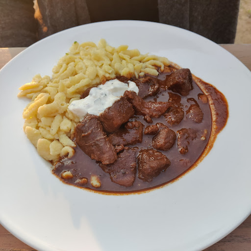 Auch die Speisekarte gefällt mir ganz gut: nicht zu überladen, aber ganz gute Auswahl und obwohl es traditionell deutsche Küche gibt, ist auch die eine oder andere vegetarische Option dabei. Ich hatte Käsespätzle und meine Frau Rindergoulash. Beides war wirklich gut. Nett fand ich, dass in den Spätzle neben den obligatorischen Röstzwiebeln noch Schmelzzwiebeln mit am Start waren. Bei mir gab es außerdem noch einen Salat dazu, der erstaunlich lecker und frisch war. Ich mochte auch das dezente Dressing und die Tatsache, dass er darin nicht ertränkt wurde. Nur die Schale war vielleicht etwas klein, um ihn ordentlich zu essen, ohne dass an der Seite etwas rausfällt.