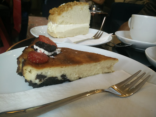 Let us begin with the matter of food quality. The cakes were quite good, though not particularly memorable. We sampled the cheesecake, the Snickers cake, and a rhubarb cake — the latter was by far the most enjoyable. The coffee, on the other hand, was rather unremarkable.