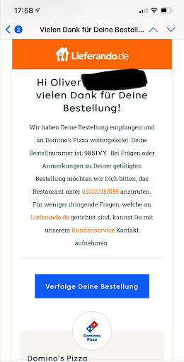 Read moreHabe bei Domino‘s Pizza Potsdam West was bestellt, via Lieferando.
