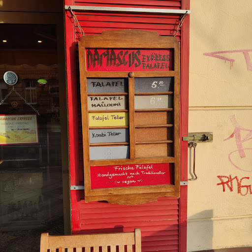 Damascus Express ist ein kleiner Falafel-Imbiss, der etwas versteckt nah an der S-Bahn Haltestelle Babelsberg liegt. Um in den Genuss der Falafel zu kommen, muss man allerdings erst einmal zur richtigen Zeit da sein, denn die Öffnungszeiten sind etwas speziell. Unter der Woche hat der Laden von 11.30 Uhr bis 20 Uhr auf, am Wochenende gar nicht. Und um berufstätige Leute besonders zu ärgern, wird nochmal genau zwischen 16 und 17 Uhr eine Stunde Pause gemacht, damit man auch ja nicht direkt nach Feierabend da aufkreuzt.