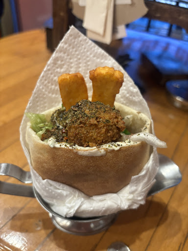 Read moreVorab, der Falafel ist tatsächlich sehr lecker, aber unter dem Strich einfach viel zu teuer, weil man, um wirklich satt zu werden, eigentlich 2 Falafel benötigt. Damit wäre man bereits bei 10 €. Das Problem ist, die Portionsgröße richtet sich nach der ziemlich kleinen Pita-Tasche, die verwendet wird. Warum auch immer, wird auf diese Mini-Pita gesetzt. In Berlin mag ich es, dass die Falafel in großen Fladen eingerollt werden und danach noch im Kontakttoaster kurz angerostet werden, sie habe vor allem dann eine ausreichende Große und ich bezahle gern 6 - 7 € und ich bin am Ende auch satt. Besonders merkwürdig sind auch die Öffnungszeiten. Wenn ich um 20:00 Uhr Feierabend mache, ist die Bude bereits geschlossen. Na dann...