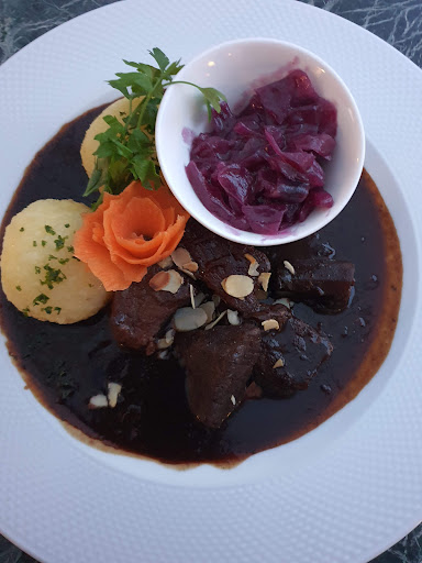 the goulash was nothing like that of hungary, which the waiter told us before we made the order. it was nicely presented with a flower made from thin sliced carrot. but there were only 4 chunks of beef, cooked like dry wood, their special sauce did not help at all. all that for 17.50 euro, a total waste of money.