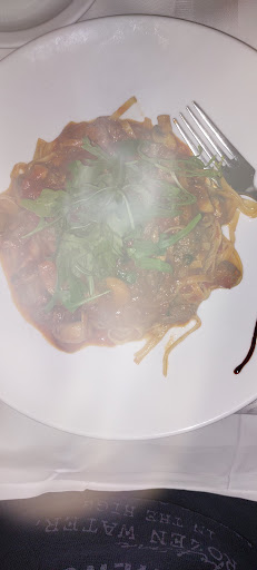 Dann hatten wir Hausgemachte Bandnudeln mit Filetspitzen vom Rind mit frischen Champignons und Rucola (20€ pP). Das war ganz schlimm. Die Filetspitzen vom Rind bestanden aus knorpeligem zähen Fleisch, an dem ich ewig herumkauen musste. Ich weiß nicht, ob man Filet zu Tode braten kann ... oder es war ganz einfach kein Filet, weiß nicht. Und das ganze in einer pampigen Tomatensauce ohne irgendeinen erwähnenswerten Geschmack. Die Champignon waren optisch vorhanden, geschmacklich nicht. Wie man das zustande gebracht hat, ist mir ein Rätsel. Da die Champignonstücke auch alle ziemlich klein waren, waren es vielleicht auch gar keine frischen, sondern Dosenchampignons. Würde mich jetzt auch nicht mehr wundern. Hat auf jeden Fall insgesamt furchtbar geschmeckt und ich konnte mich nicht dazu bringen aufzuessen, obwohl ich wirklich Hunger hatte und das Ganze nicht gerade preiswert war.