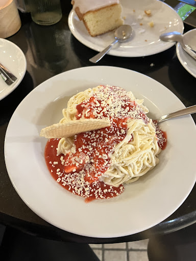 An extreme cute and typical Eis-Cafe in Germany. There was sun after 2 months and of course everyone was visiting the ice-cafes today, which are a rarely discussed but important culture of German gastronomy culture. Of course, my typical choose was Spagetti ice, and the other traditional Lemon-Cake were really tasty and with good portions. Coffees are also amazing and they have vegan milk offers as well. The atmosphere makes you feel like you are living just next to the palace in old times, the decoration is very cute. Just, as it was saturday afternoon, the toilet floors were wet and dirty, but still better than berlin standards. A little bit pricy but considering the venue and service, it totally makes sense. I will definitely...