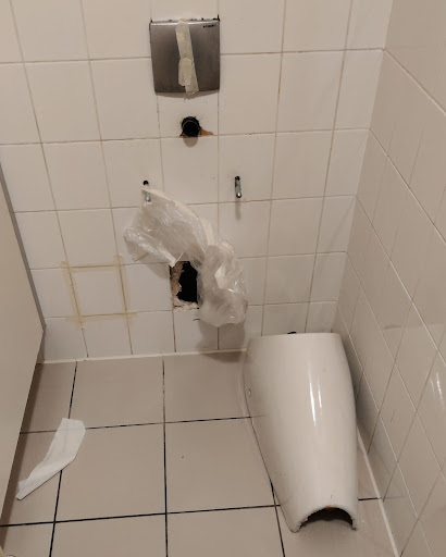 Wir waren dieses Mal natürlich drinnen und hier ist mir gleich mal aufgefallen, dass es drinnen nicht ganz so gemütlich ist wie draußen. Obwohl der Saal eigentlich geräumig wäre, ist er so mit Tischen zugestellt, dass alles sehr eng ist. Klar will man viele Kunden bedienen, aber in der Form hat das schon sehr vollgestellt gewirkt. Ich weiß auch nicht, was um alles in der Welt mit der Toilette passiert ist. Fairerweise muss man sagen, dass zumindest eine benutzbare Kabine zur Verfügung stand, aber direkt beim Gang auf die Toilette mit den Trümmern des Urinals begrüßt zu werden, macht keinen besonders guten Eindruck.