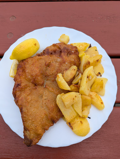 Frischer Seelachs ( 10 Euro) in Bierteig klebt am Pappteller ( voller Fett), Remoulade lieblos auf winzige Portion Kartoffelsalat ( Fertigkost ) geklatscht... ...GRAUENHAFT