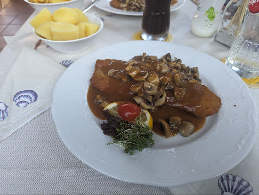 Zurück zu Haus Felsenburg. Bestellt haben wir zweimal das Jägerschnitzel. Eigentlich wollten wir Fisch essen, jedoch wurde uns auf Nachfrage mitgeteilt, dass man die Senfsauce nicht selber kochen würde. Die käme aus der Tüte. Also zweimal Schnitzel bestellt, da kann man weniger falsch machen, so dachten wir. Und wir hatten wirklich Hunger!