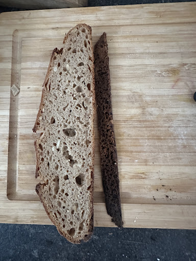 Burned bread, for 9€, I think it’s very overpriced, I couldn’t buy bread with a puppy in my hands, needed to wait outside, that girls would bring me bread outside, because not allowed with dogs, overpriced products, and hassle didn’t worth it. Bread + coffee + bag...