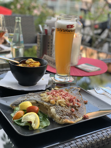 Read moreWir haben gestern einen Tisch für 6 Personen reserviert. Am Restaurant angekommen wurden wir im Außenbereich in Empfang genommen und zu einer Bierzelt -Garnitur gebracht....... Alle Tische und Stühle waren im dunklen Rattan Stil gehalten und wir mussten uns wie auf einem Sommrfest auf 2 Klappbänke mit einem Kleinkind setzen..... Ohne Worte. Mein Backfisch war gut,die bei der Bestellung empfohlenen Bratkartoffeln waren wenn überhaupt nur leicht in Paprikapulver angeschwenkt. Die Filetspitzen (vom Schwein) meiner Frau und meiner Tochter waren zum Teil noch roh und das Paprika Gemüse (Ratatouille)wurde mit Maggi Fix Pulver zubereitet. Wegen möglicher Zusatzstoffe und Allergene im den Gerichten soll man lt. Karte direkt das Personal befragen!?! Warum nicht direkt aufführen, wie in jeder Pommes Bude ? Da hätte ich mir den folgenden starken allergischen Juckreiz auf der Haut sparen können. Aber weiter: Das Wiener Schnitzel meiner beiden kleinen Töchter war dick, sehnig und wurde im Mund immer mehr. Meine Kleine hat nach 3 Bissen das Kauen aufgegeben. Zum Ende haben wir uns 2 Latte Machiato bestellt. Der 'Milchschaum' war ca. 1cm "hoch" und war nach dem Servieren verschwunden. Nach dem ersten Schluck war klar, es handelt sich um einen dünnen geschmacklosen Instant Kaffee...... Unmöglich: Rauchende Gäste.... Falscher Film ???? Fazit: Ungemütlich gesessen, schrecklich gegessen (bis auf den Backfisch), allergische Reaktionen, unzufriedene Kinder, Sodbrennen und 150€...