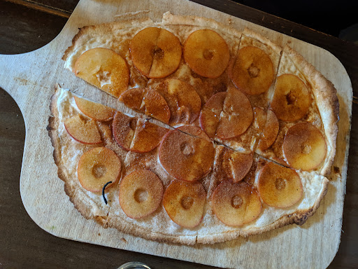 It's a huge place and when we arrived it was almost empty. Kinda annoyed that they wouldn't let us have any table because everything was booked even though it was 4:00pm in the afternoon... We had to get takeout instead that's why my photos show the food on aluminum tin foil lol. But maybe they felt bad and finally gave us a seat but said we couldn't stay long. Whatever, we were hungry so we devoured the whole thing in 15 minutes and left. The Flammkuchen was amazing.