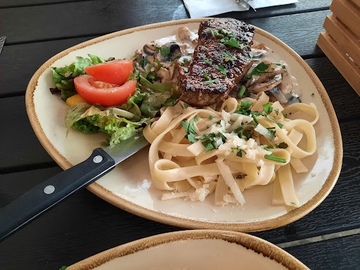 Read moreErwartungen waren aufgrund der Bewertungen und Bilder recht hoch. Wir hatten Plätze bestellt, was offensichtlich dringend anzuraten ist, da es recht gut besucht war (hauptsächlich anscheinend Touristen). Wir bekamen im Außenbereich nach hinten raus einen Tisch, den wir dann aber doch nicht so gut fanden. Direkt daneben befindet sich der Ausgang des Küchenbereichs und entsprechend war die Lautstärke und das Ambiente wie im Durchgang. Drinnen war der Platz aber durchaus gut. Das Personal war sehr freundlich. Dass sie wegen des hohen Besuchaufkommens etwas überfordert waren möchte ich nicht wirklich bemängeln. Vorspeisenplatte war gut. Gibt es nichts zu meckern. Hauptspeise gab es für mich Lachs im Honig-Senf-Mantel auf mediterranem Gemüse mit Rosmarinkartoffeln. Nicht schlecht, allerdings war es lediglich ein Stück Lachs der nach dem Braten/Backen von der Haut entfernt wurde. Mit dieser Seite nach oben wurde er serviert. Unter der Haut ist der Fisch dann aber immer etwas "schleimig", was mit einem Klecks Honig-Senf-Marinade etwas bedeckt wurde. Das war jetzt nicht meine Vorstellung von Honig-Senf-Mantel. Die Rosmarinkartoffeln waren gut, aber den Rosmarin würde ich eher nicht dazwischen haben wollen, da die Nadeln einfach nur hart und ungenießbar sind nach dem Garen. Ob die Schale dran bleiben kann würde ich daran fest machen ob es BioKartoffeln sind oder nicht. Das Steak meines Mannes war gut und medium gebraten. Allerdings wurde nach dem Gargrad nicht gefragt. Alles in Allem war es ganz nett, aber da ist noch...