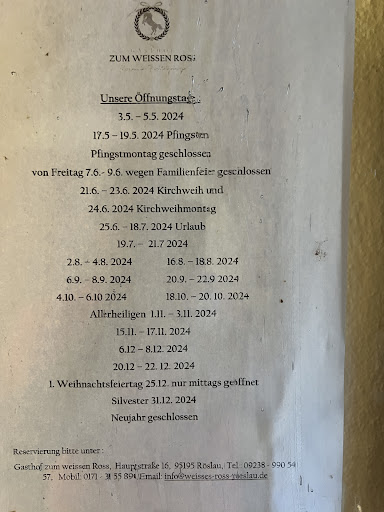 Der Gasthof Weißes Roß in Röslau ist ein traditioneller und gemütlicher Gasthof mit einem freundlichen und zuvorkommenden Service. Die Speisekarte bietet eine breite Auswahl an fränkischen Gerichten und saisonalen Spezialitäten.