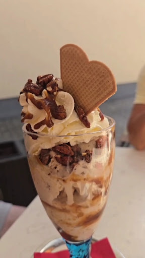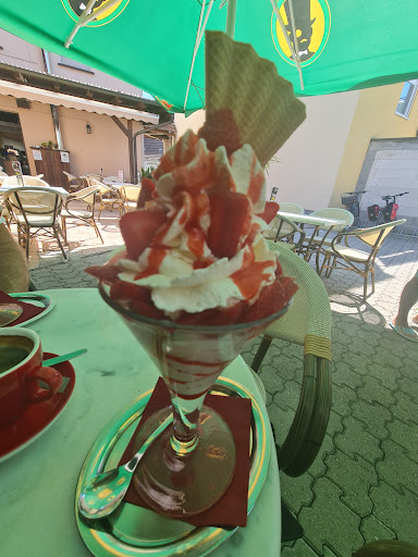Nice place with seating terrace in the back. Large menu with wide variety of ice cream and cakes. Large portion sizes and the ice cream served was good. Service was very nice, but a bit spotty. We visited an a Sunday afternoon so the place was packed, with loads of people in the shop...