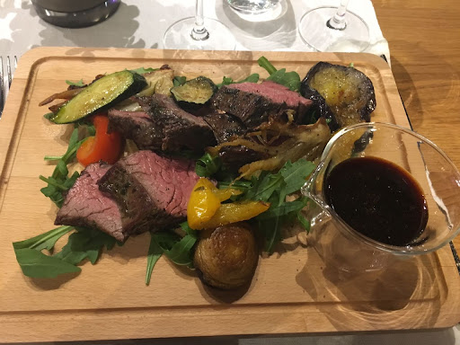 das essen: die auswahl fiel insgesamt schwer, obwohl die speisekarte eher klein (und wechselnd, wie wir erfuhren), aber sehr vielseitig und vielversprechend war. der antipasti vorspeisenteller war phantastisch. bei der hauptspeise wurden wir zur steakauswahl richtig beraten und das nebraska steak war perfekt gegart und geschmacklich ein gedicht. dazu die wahl aus diversen selbstgemachten dips und eine selbst gemachte kräuterbutter, nebst lecker gewürzten und knusprigen drillingskartoffeln. die desserts waren raffiniert (die minzcreme - aaaahhhh!!!). es bleibt noch zu erwähnen, dass die mengen üppig sind - keine spur von klitzekleinen edelportiönchen.