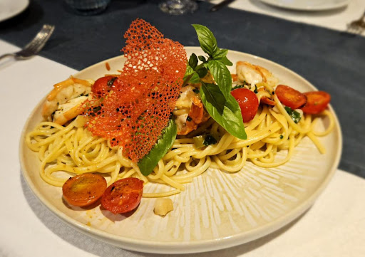 The seafood linguine was absolutely delicious – perfectly cooked pasta, fresh and juicy shrimp, sweet roasted cherry tomatoes, and a vibrant basil touch. The crispy red garnish added both crunch and elegance. Beautiful presentation and rich Mediterranean flavors. Friendly service and great ambiance. Highly recommended – a must-visit spot for food...