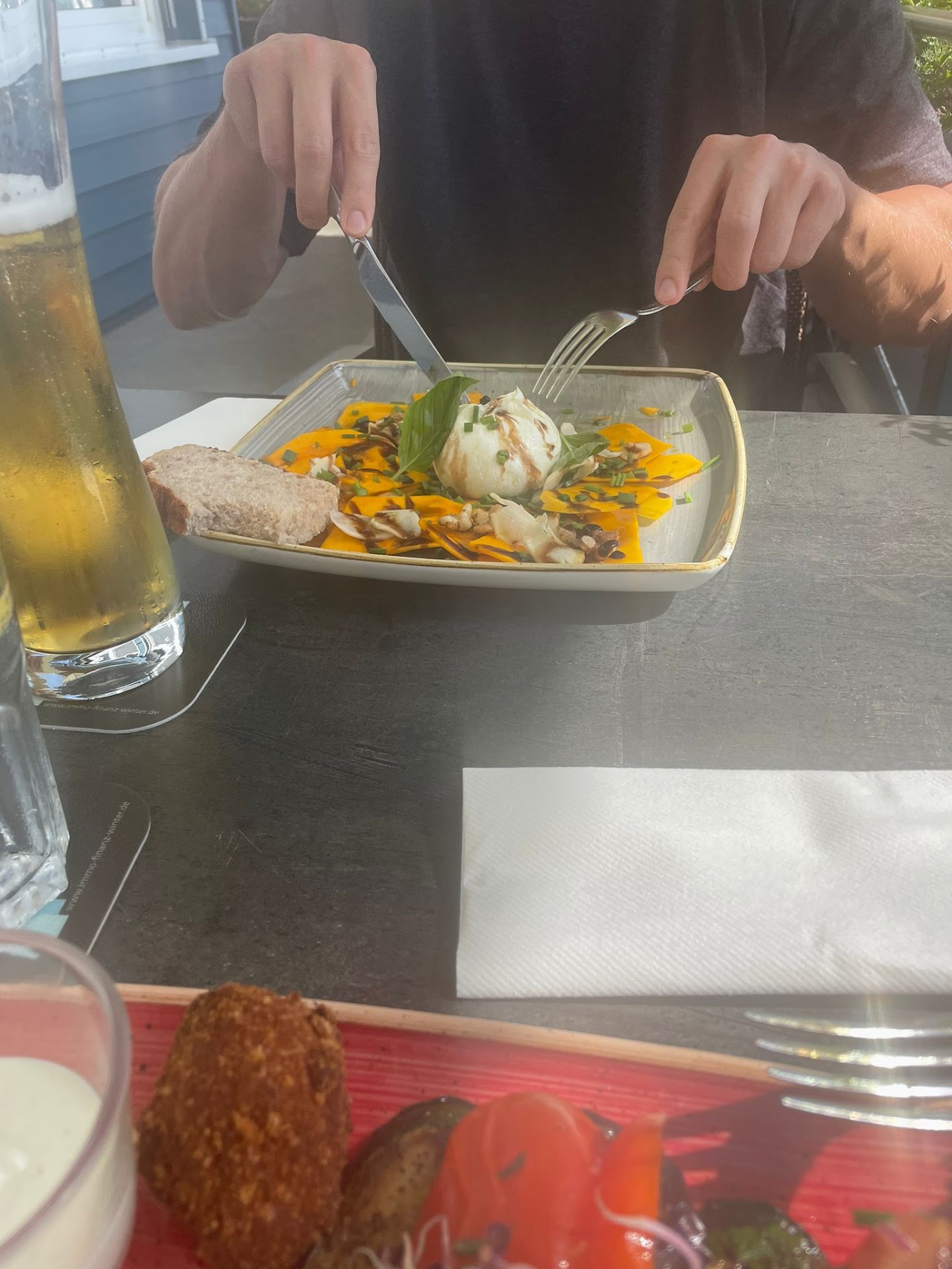 Wir waren heute zum ersten Mal hier, um zu essen. Die Lage ist sehr schön, und ich dachte, ich hätte ein neues Restaurant gefunden, in dem ich regelmäßig essen kann. Ich hatte eine Vorspeise mit Falafel und Gemüse für zwei Personen. Es war sehr lecker, aber meiner Meinung nach etwas zu teuer. Mein Freund bestellte eine Burrata mit Kürbis als Hauptspeise. Diese Speise war wirklich eine Enttäuschung. Es gab einfach geschnittene Kürbisscheiben, die fast roh und ungewürzt waren, mit einer Burrata in der Mitte – geschmacklich eine Null. Mein Freund war danach überhaupt nicht satt, und das Gericht kostete 24 Euro. Für diesen Preis sollte man zumindest satt werden können. Er sagte, er habe noch nie so wenig für so viel Geld bekommen. Zusammengefasst war die Lage sehr schön, die Bedienung freundlich und gut, aber die Preise sind extrem überhöht. Mein Essen hat zwar gut geschmeckt, aber es war für 21 Euro zu teuer. Ich frage mich, wer sich das Essen dort leisten kann. Die Preise sind zu hoch, obwohl in Deutschland durchschnittlich höchstens 2.500 Euro Netto verdient werden. Ich denke, hier können nur wohlhabende Menschen essen gehen.