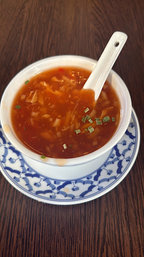Read moreGeht so... Suppe war geschmacklich gut aber Gemüse war kaum vorhanden. Meiner Meinung nach beides sehr lieblos gekocht. Gebackenes Huhn und Reis war gut aber die Erdnusssoße hätte fettiger nicht sein können. Salz war für meinen Geschmack etwas zu viel. Frisches Gemüse waren eigentlich nur Karotten und Zwiebeln drin... Für fast 10€ kann man schon mehr frisches...