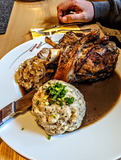 Unsere Wahl fiel auf das parnierte Forellenfilet mit Wildkräuter- & Kartoffelsalat und die Schweinshaxen mit Knödel und Krautsalat. Nach noch nicht einmal 10 Minuten Wartezeit war das Essen bereits auf den Tisch.