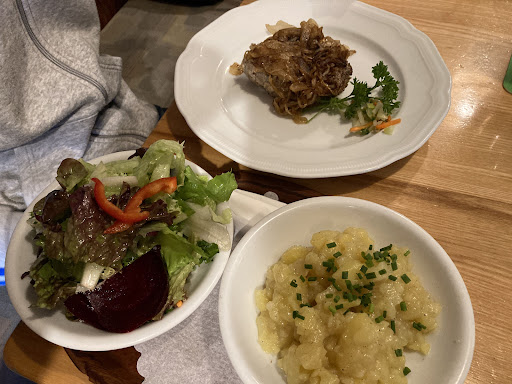 Stand Februar 2024: So kostet der Zwiebelrostbraten bestehend aus einer Scheibe Braten + Bratkartoffeln + Beilagensalat inzwischen 29,40 EUR. Das Rumpsteak, welches ggf. an der 200g Marke kratzt wird mit Bratkartoffeln + Beilagensalat gereicht und kostet stattliche 31,40 EUR. Ein Feinschmeckersalat liegt bei 16,80 EUR. Ein kleines Schälchen Leberknödelsuppe liegt bei 6,80 EUR... Diese Beispiele sollten aufzeigen was ich meine.